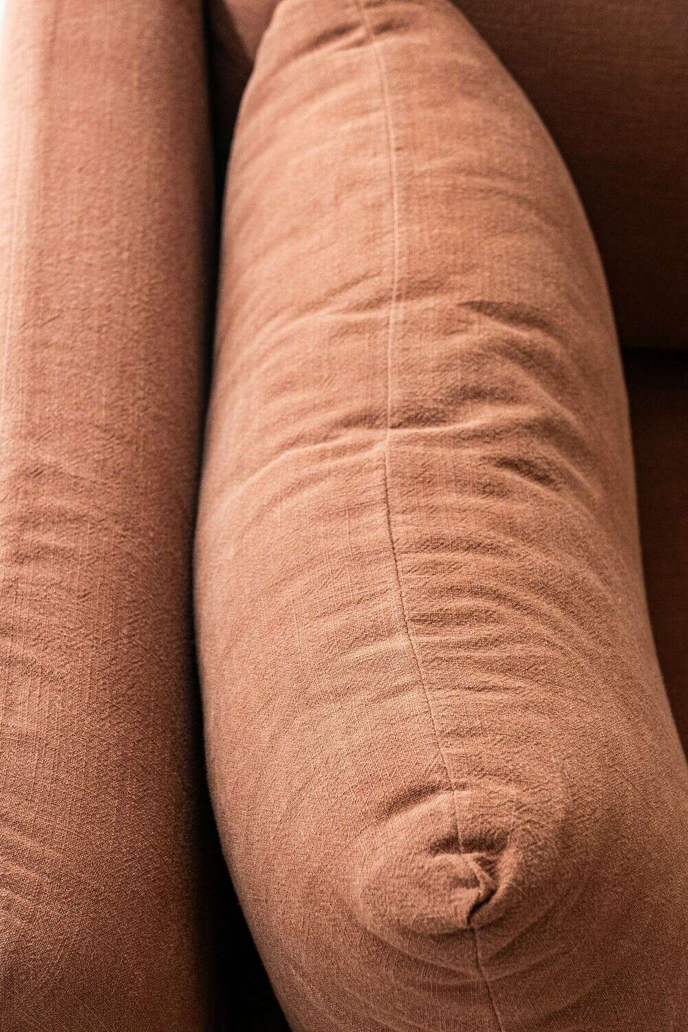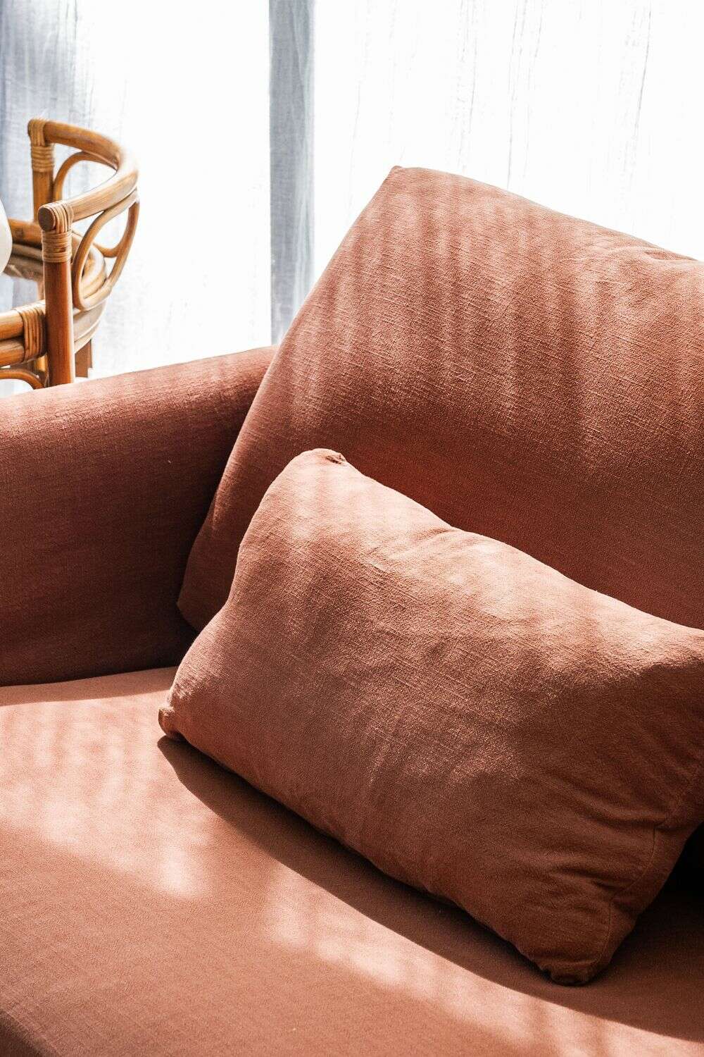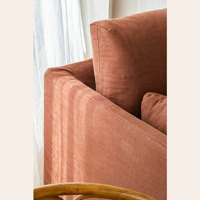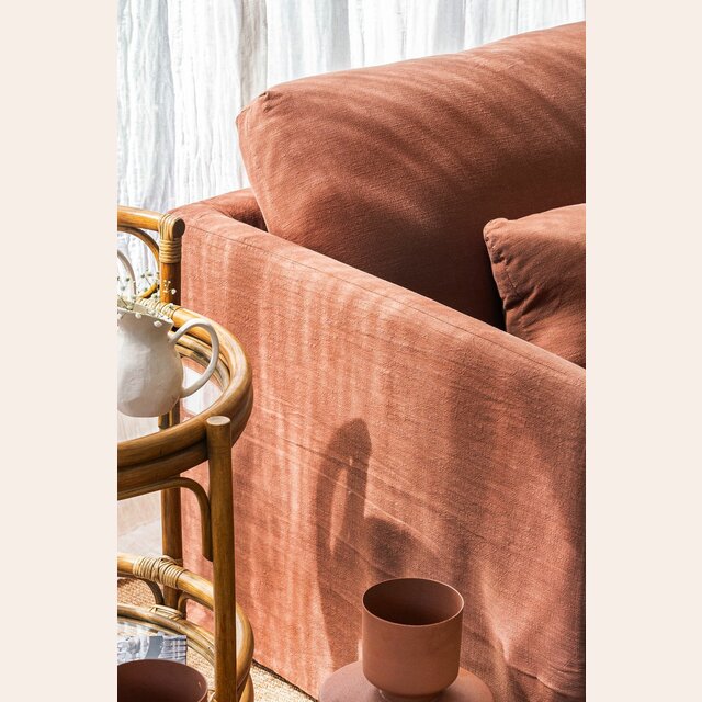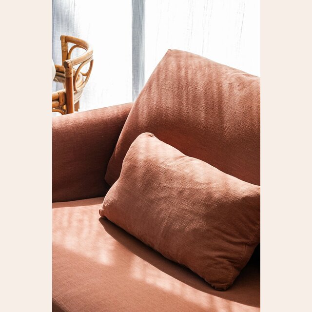 Un color profundo y atemporal en tono terracotta-ladrillo, tela 100% desmontable para lavar en lavarropas con agua fría.