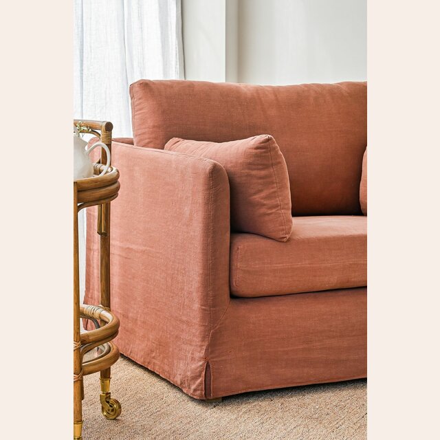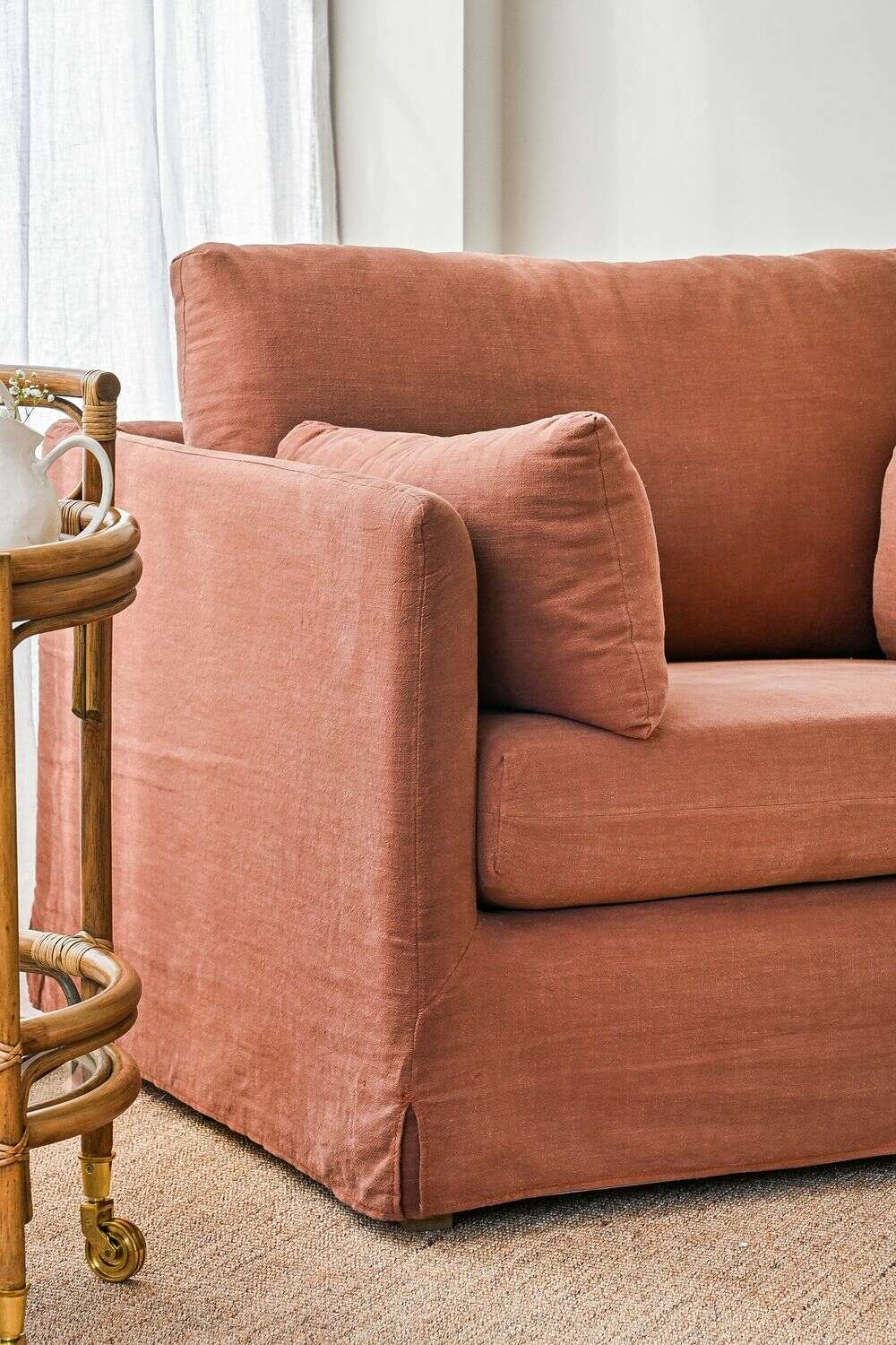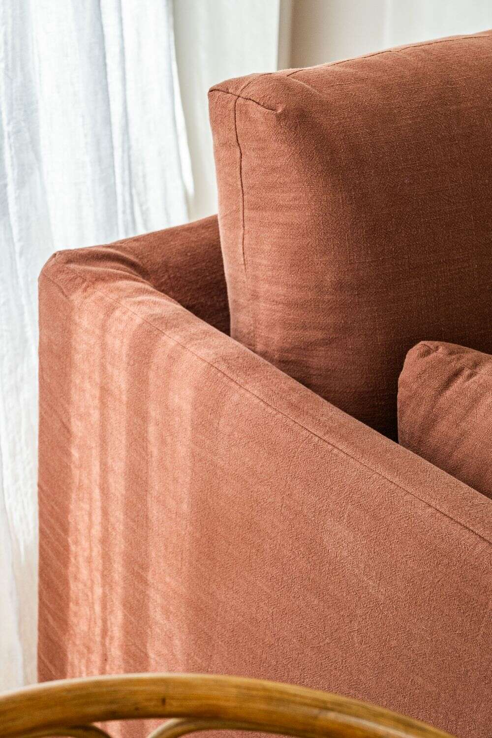 Un color profundo y atemporal en tono terracotta-ladrillo, tela 100% desmontable para lavar en lavarropas con agua fría.